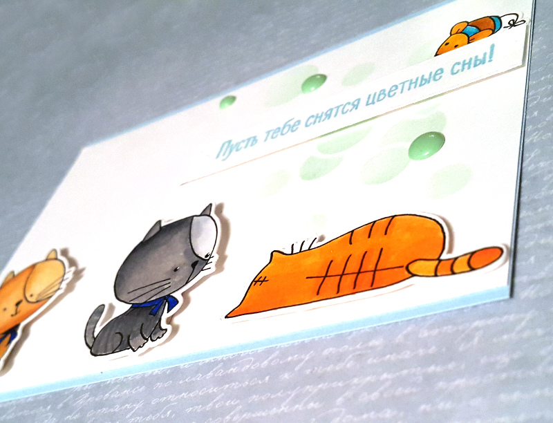 Котики приподняты над основой на пивном картоне, поэтому от них даже есть тень как от настоящих))) Пузырьки волшебного сна сделана с помощью маски и чернилок Altenew.